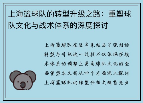 上海篮球队的转型升级之路:重塑球队文化与战术体系的深度探讨